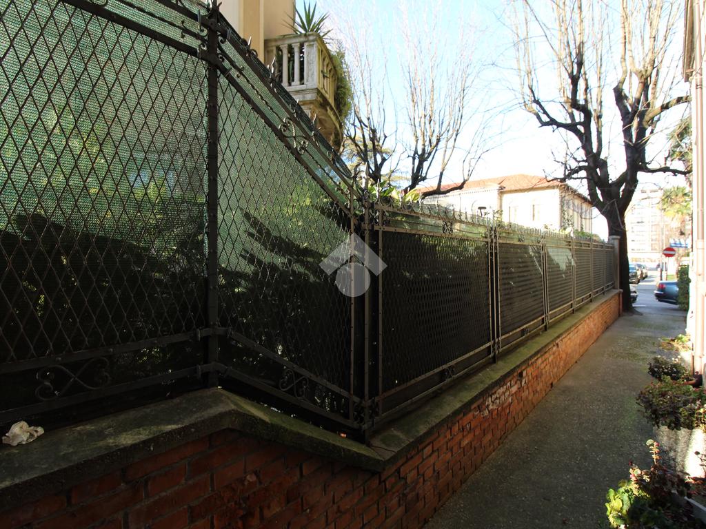Accedendo al lotto da Via Nazario Sauro mediante un ampio cancello carraio, arriviamo sul retro del fabbricato, nel quale troviamo un’ampia area parcheggio coperta e scoperta.