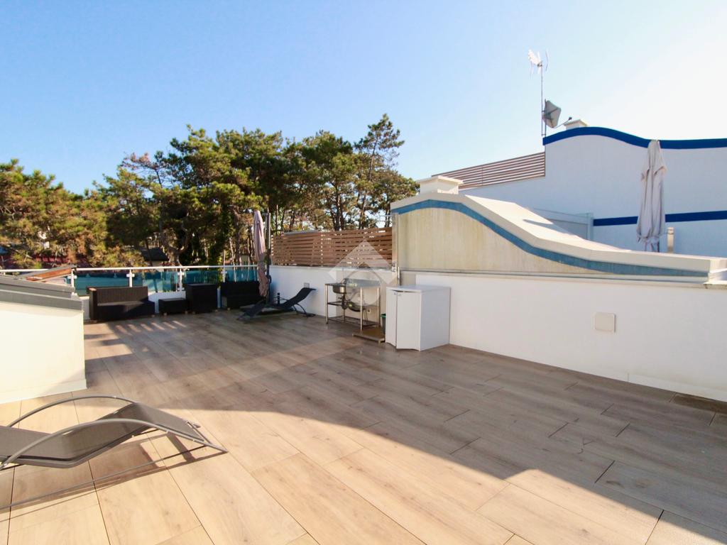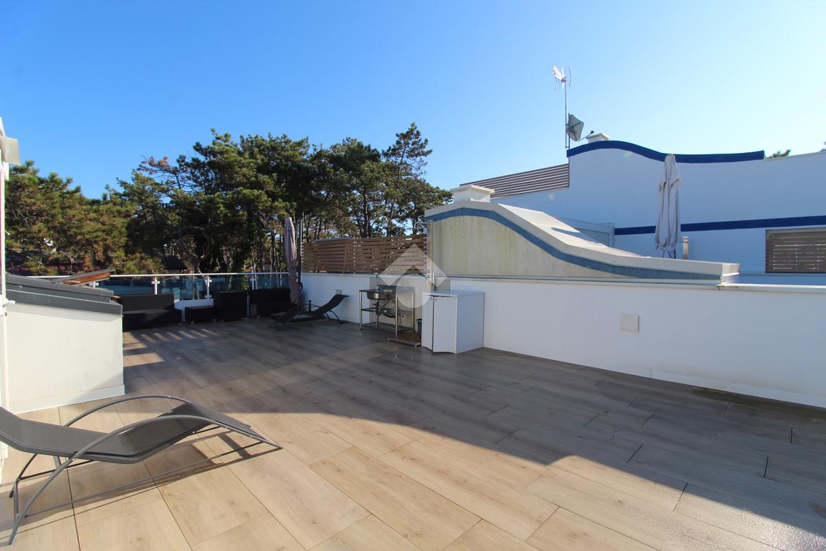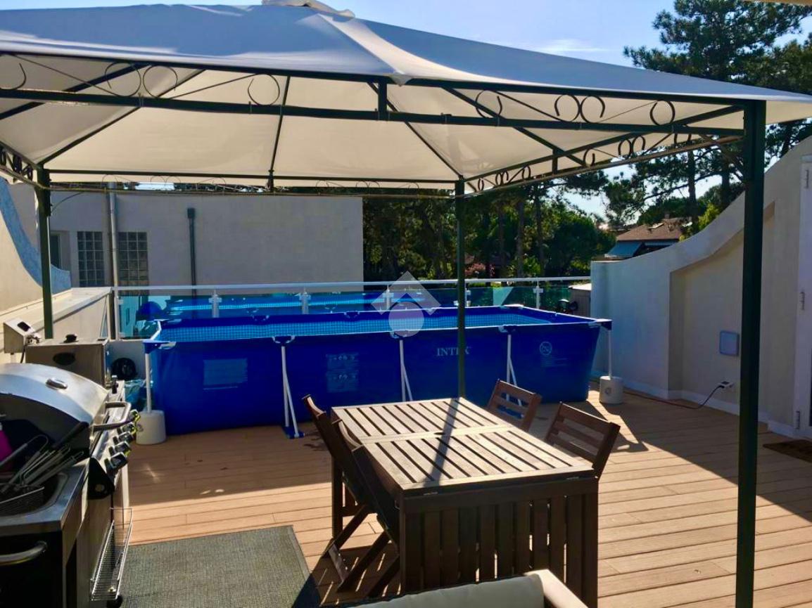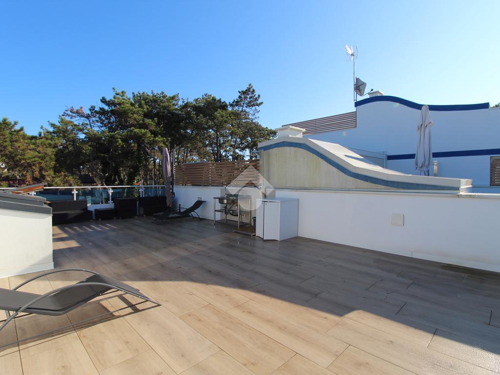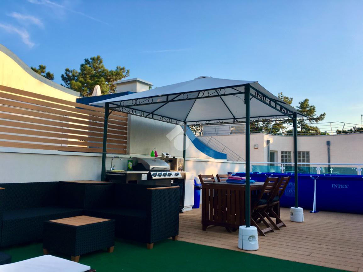 Dalla zona giorno passiamo alla terrazza all’ultimo piano tramite la scala interna, dove abbiamo la doccia, un lavabo, il locale caldaia, un pannello solare ed un salottino da esterno e si ha, inoltre, la possibilità di installare una piscina.