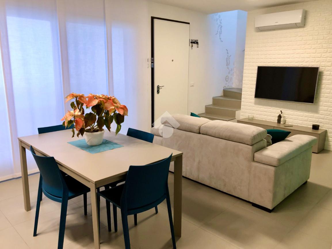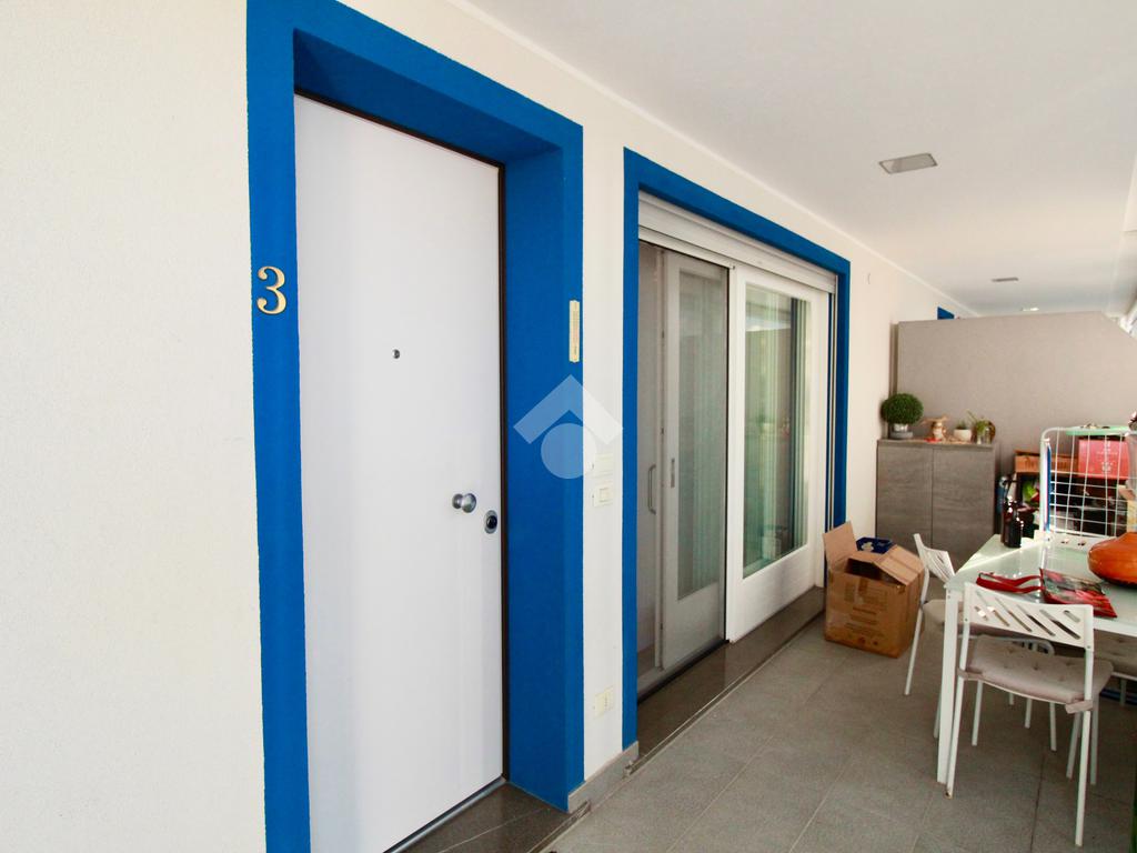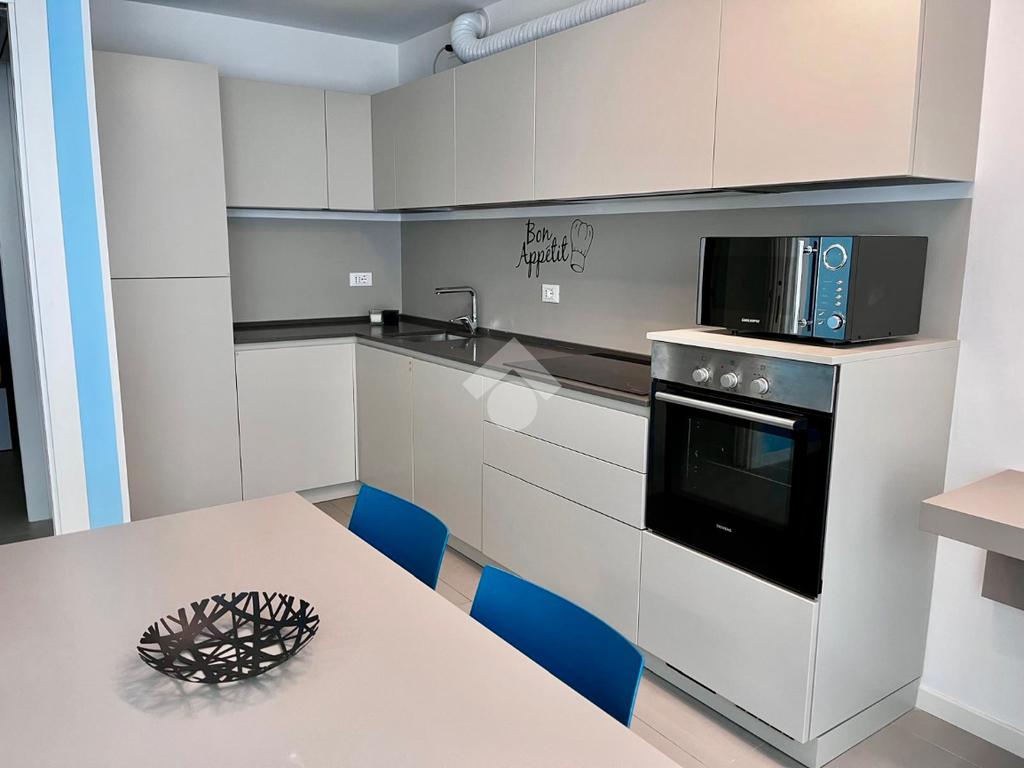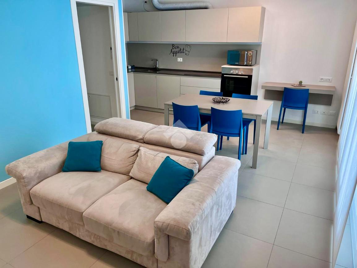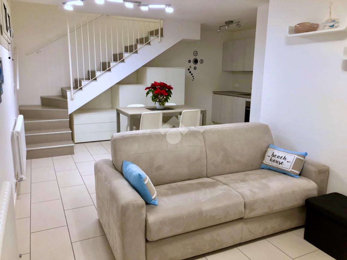 Dopo aver oltrepassato il cancello e percorso un tratto del marciapiede di ingresso del residence, ci troviamo nel primo terrazzino e, di fronte, al portoncino d’ingresso dell’immobile, dal quale si accede al locale pranzo soggiorno composto da cucina, con piano cottura a induzione, lavabo, pensili da cucina e, a completare, il divano letto ed il tavolo per sei persone.