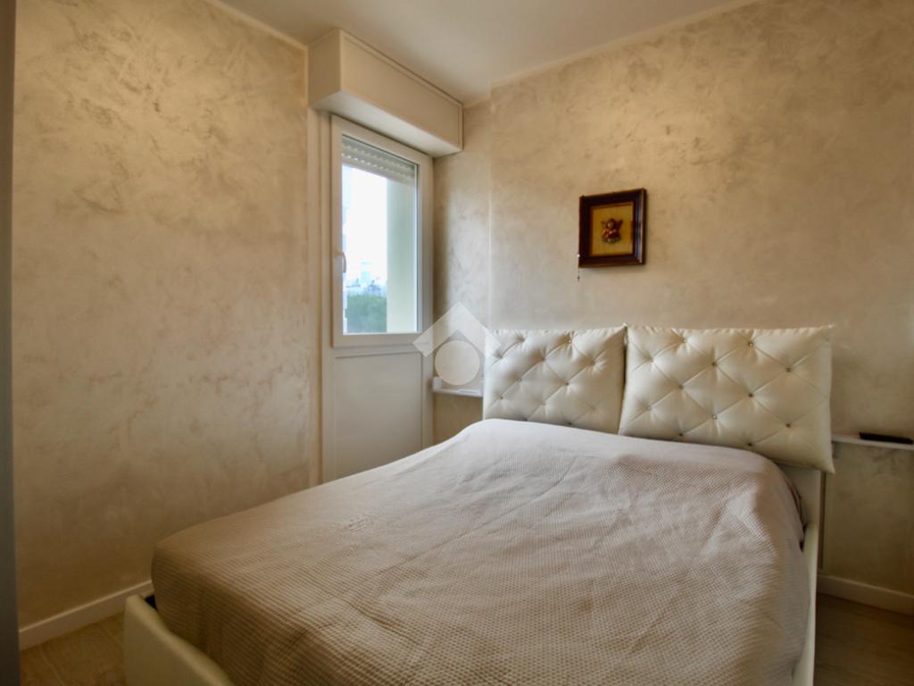Subito sulla sinistra vediamo la camera da letto dotata di letto matrimoniale con contenitore e armadio con ante scorrevoli.