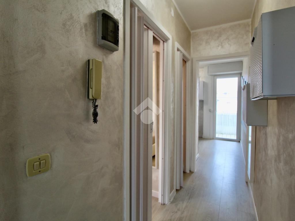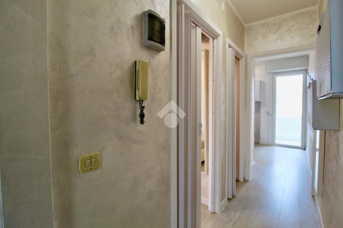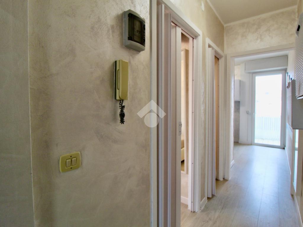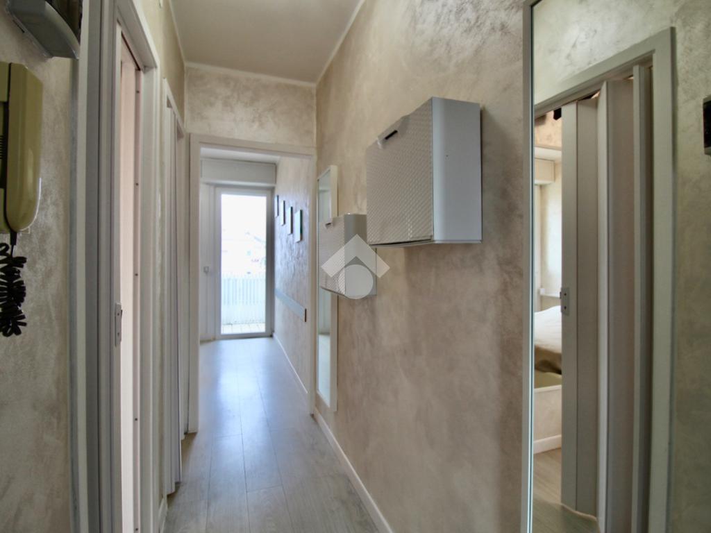 Entrando nell’appartamento mediante un portoncino moderno color legno, ci troviamo nel disimpegno che mette in relazione tutti gli ambienti.
