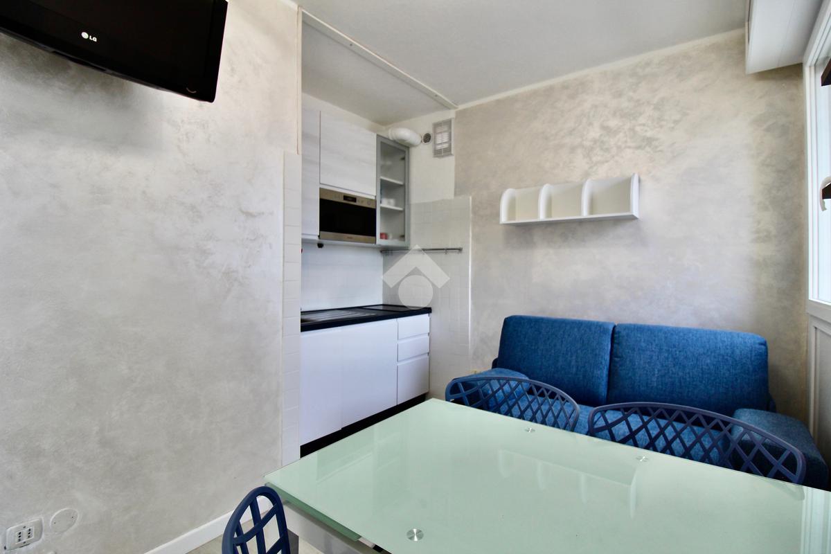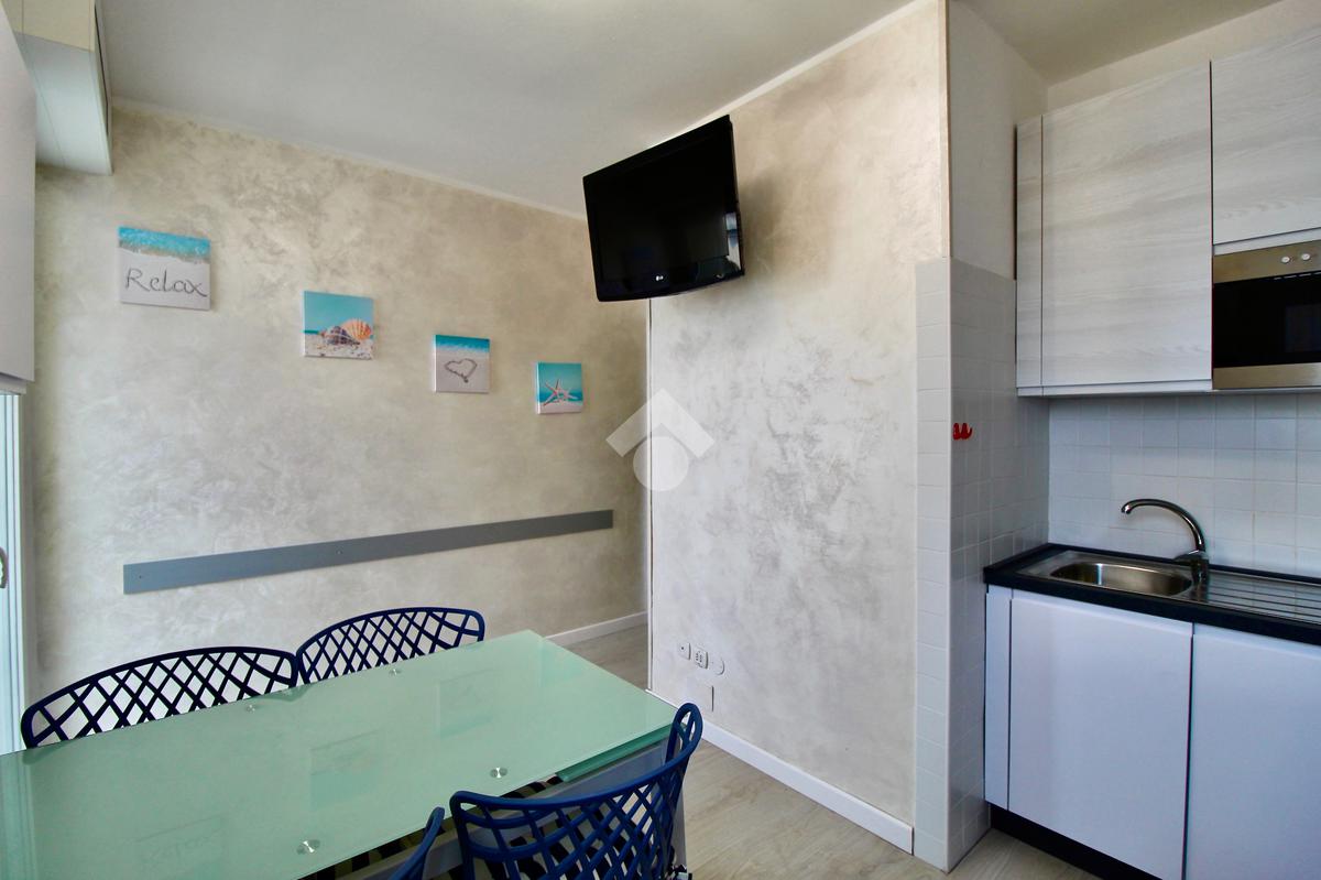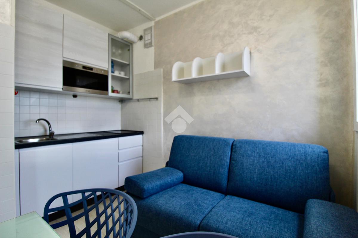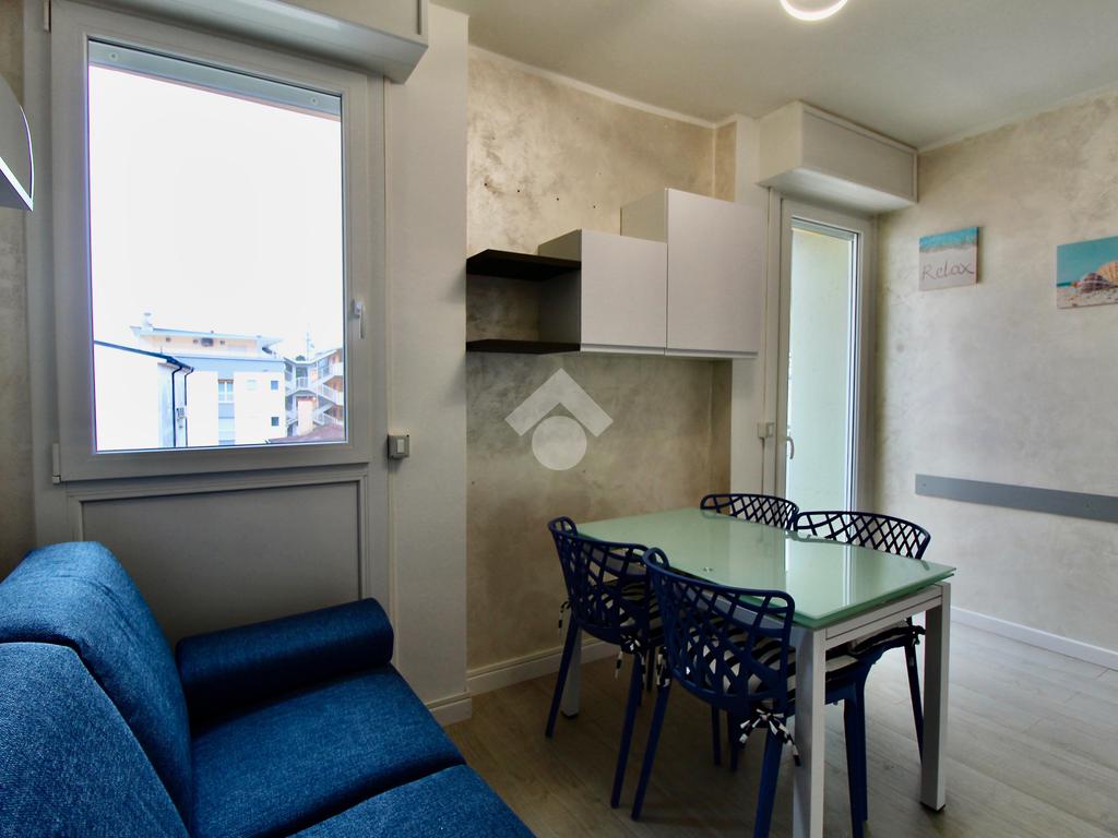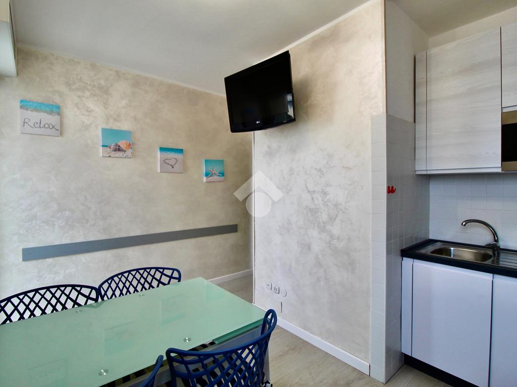 Frontalmente rispetto all’ingresso c’è il locale destinato al pranzo – soggiorno, dotato di angolo cottura in nicchia con piano a induzione, lavabo e forno elettrico, tavolino ampliabile e sedie, divano letto matrimoniale. Dal soggiorno si accede ad un balconcino che si affaccia sul viale pedonale.