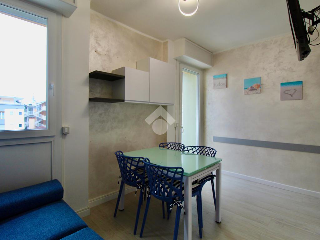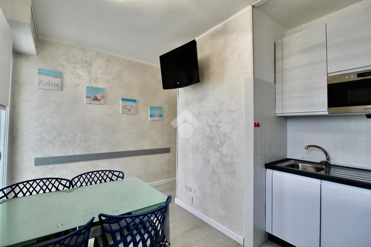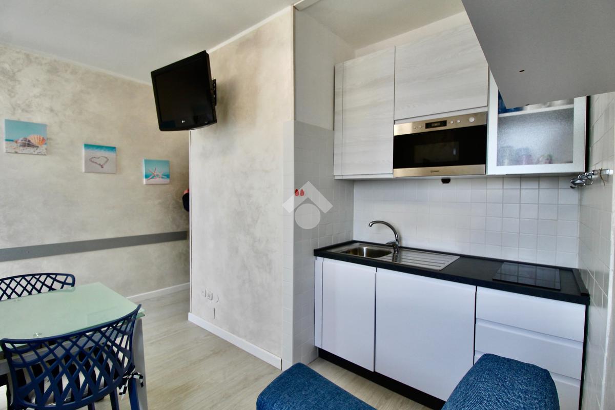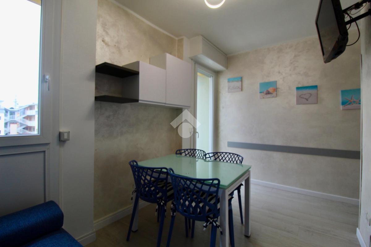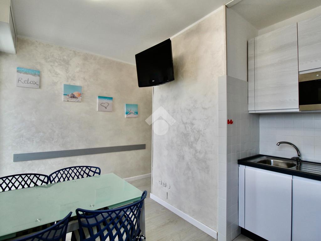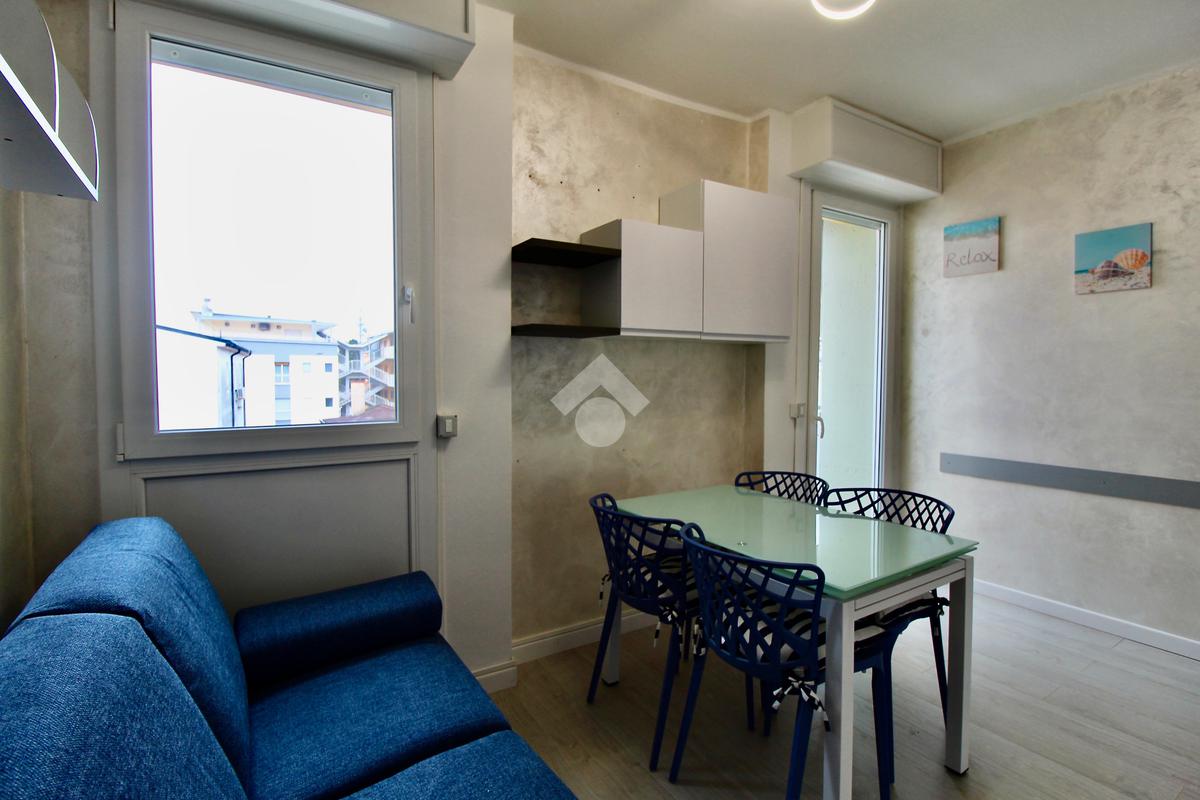 Frontalmente rispetto all’ingresso c’è il locale destinato al pranzo – soggiorno, dotato di angolo cottura in nicchia con piano a induzione, lavabo e forno elettrico, tavolino ampliabile e sedie, divano letto matrimoniale. Dal soggiorno si accede ad un balconcino che si affaccia sul viale pedonale.