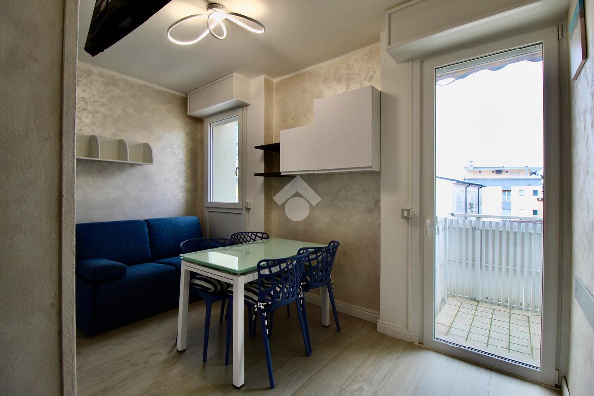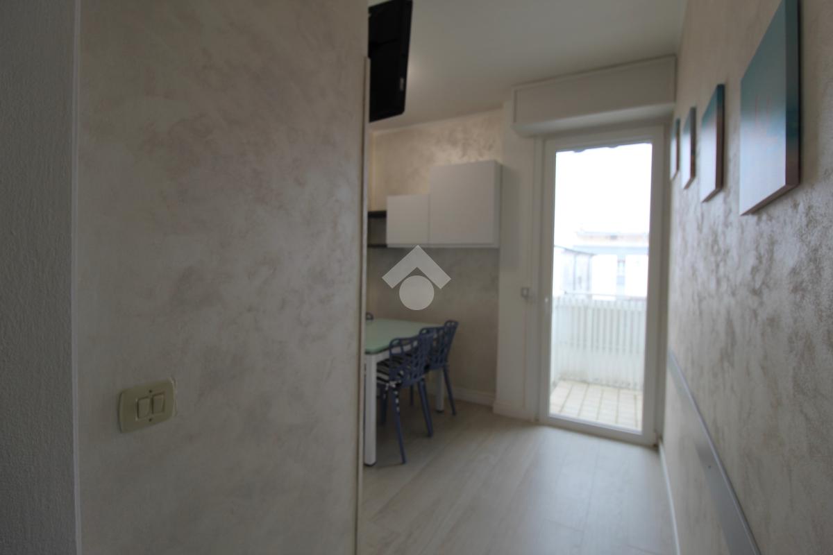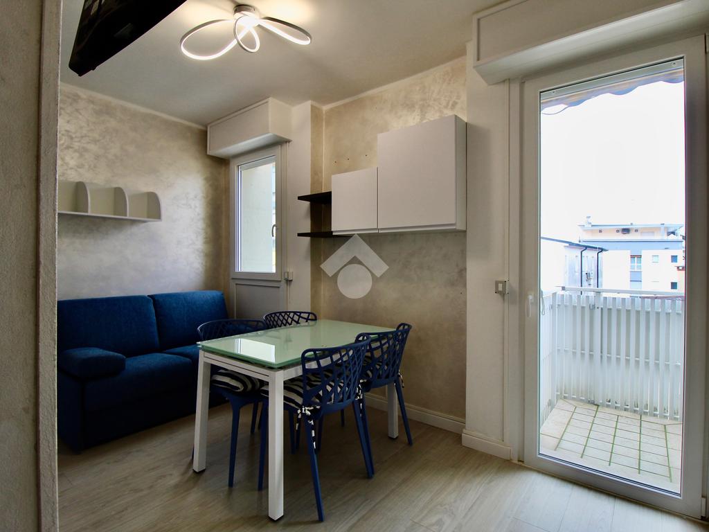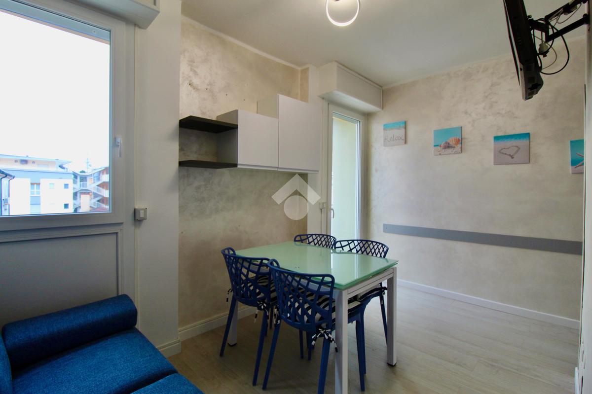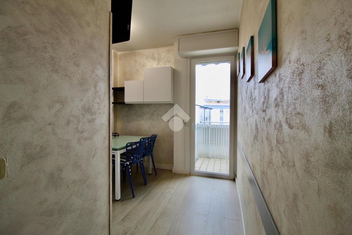 Frontalmente rispetto all’ingresso c’è il locale destinato al pranzo – soggiorno, dotato di angolo cottura in nicchia con piano a induzione, lavabo e forno elettrico, tavolino ampliabile e sedie, divano letto matrimoniale. Dal soggiorno si accede ad un balconcino che si affaccia sul viale pedonale.